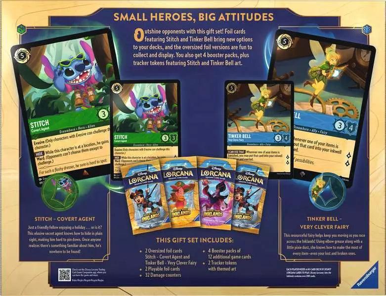 Outshine opponents with this gift set! Foil cards featuring Stitch and Tinker Bell bring new options to your decks, and the oversized foil versions are fun to collect and display.
